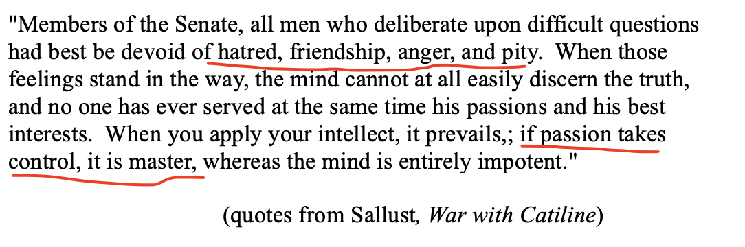 Emotions were high, nobody doubted the conspirators’ guilt. Many in the Senate wanted blood. Caesar delivered a speech in the Senate, against summary execution. His speech is a master class in swaying a group, gripped by fear and anger, away from acting on their urges.
