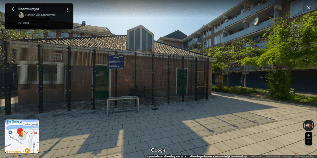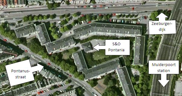 Het adres is Roomtuintjes 233, 1093 TD. Het Pontania-gebouw staat tussen de huizen in, op een binnenplaats: